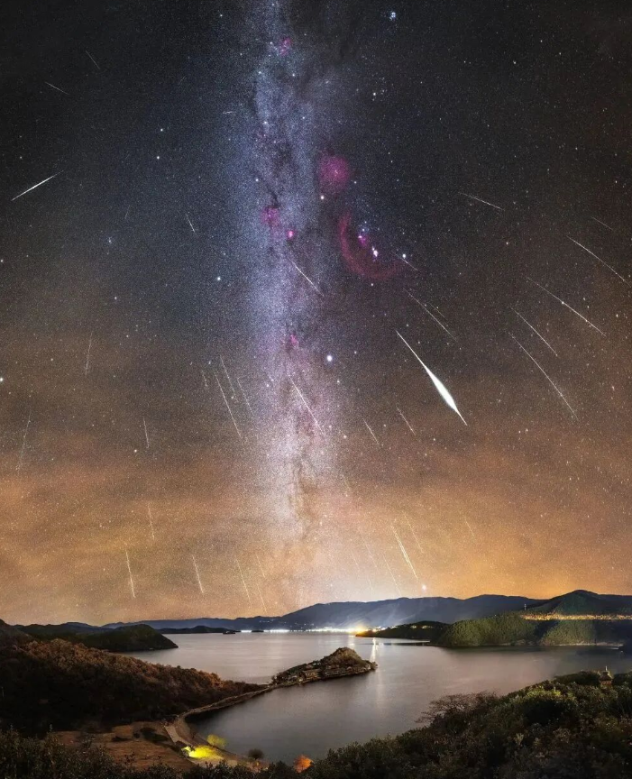 2023年12月13日夜晚至14日凌晨,在云南泸沽湖拍摄的双子座流星雨(多张叠加)。(白茂霖摄,星联CSVA供图)