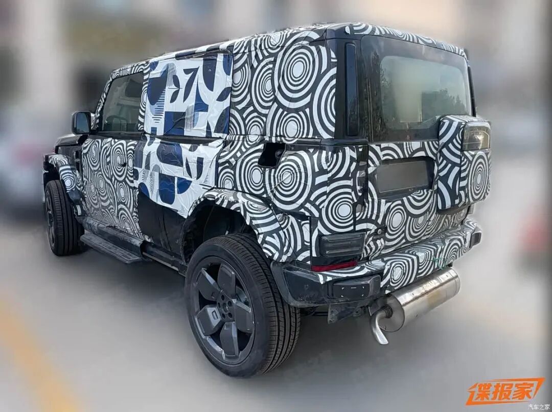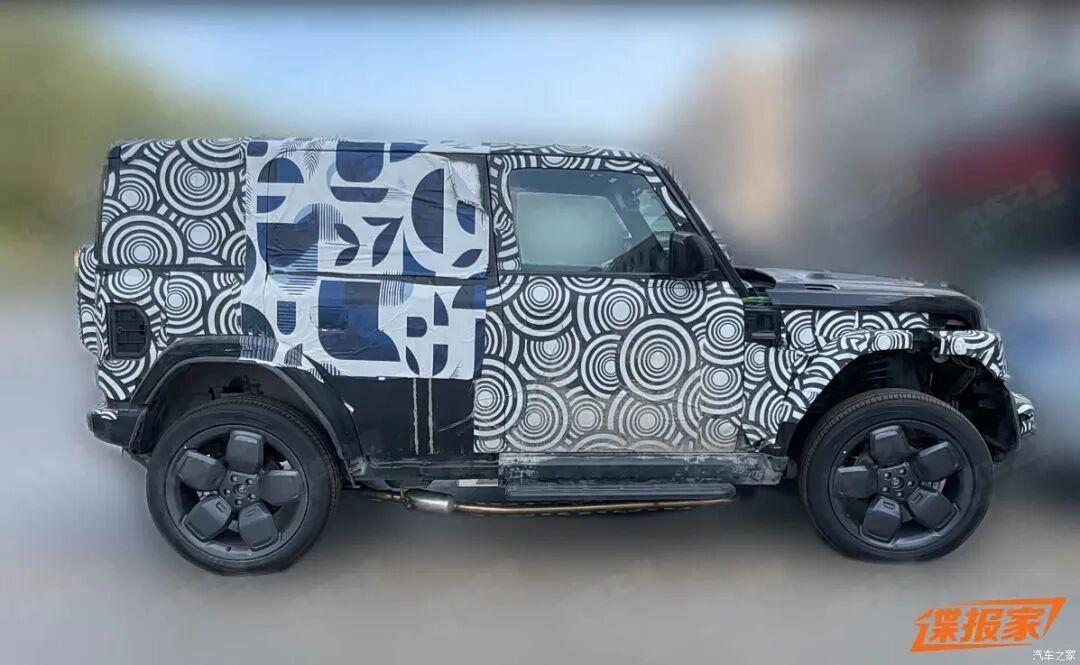 外观方面,V25与超级V23的前脸与尾部设计高度相仿,也是致敬经典的复古车设计,但车型尺寸明显更大,车身高度也疑似更高,有点非承载式SUV的感觉,对比旁边一侧的轿车,该车车身高度高出不少,离地间隙更高,但轮胎并不是越野胎。同时,新车的轴距更长,坊间传闻该车轴距为2780mm,比超级V23的2735mm更长。