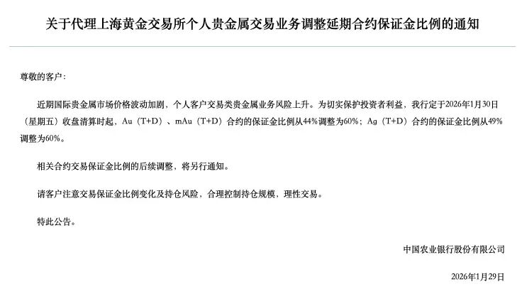 1月29日,农业银行发布《关于代理上海黄金交易所个人贵金属交易业务调整延期合约保证金比例的通知》,于1月30日收盘清算时起,Au(T+D)、mAu(T+D)合约的保证金比例从44%调整为60%。同时,农行请客户注意交易保证金比例变化及持仓风险,合理控制持仓规模,理性交易。