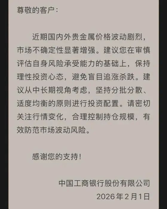 2月1日,工商银行通过公司贵金属业务部“工银金行家”公众号发布风险提示。近期国内外贵金属价格波动剧烈,市场不确定性显著增强,工行建议客户在审慎评估自身风险承受能力的基础上,保持理性投资心态,避免盲目追涨杀跌。公告建议客户从中长期视角考虑,坚持分批分散、适度均衡的原则进行投资配置,同时密切关注行情变化,合理控制持仓规模,有效防范市场波动风险。