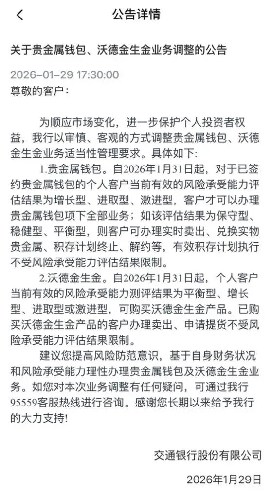 1月29日,交通银行发布公告调整贵金属钱包、沃德金生金业务适当性管理要求。具体来看,关于贵金属钱包,自1月31日起,对于已签约贵金属钱包的个人客户当前有效的风险承受能力评估结果为增长型、进取型、激进型,客户才可以办理贵金属钱包项下全部业务,如该评估结果为保守型、稳健型、平衡型,则客户可办理实时卖出、兑换实物贵金属、积存计划终止、解约等,有效积存计划执行不受风险承受能力评估结果限制;关于沃德金生金,自1月31日起,个人客户当前有效的风险承受能力测评结果为平衡型、增长型、进取型或激进型,可购买沃德金生金产品。交行提示,建议客户提高风险防范意识,基于自身财务状况和风险承受能力理性办理贵金属钱包及沃德金生金业务。