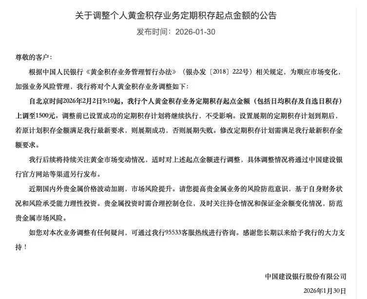 1月30日,建设银行发布公告调整个人黄金积存业务定期积存起点金额。自2月2日9:10起,建行个人黄金积存业务定期积存起点金额(包括日均积存及自选日积存)上调至1500元。